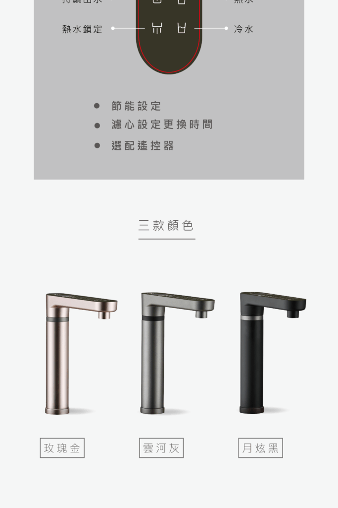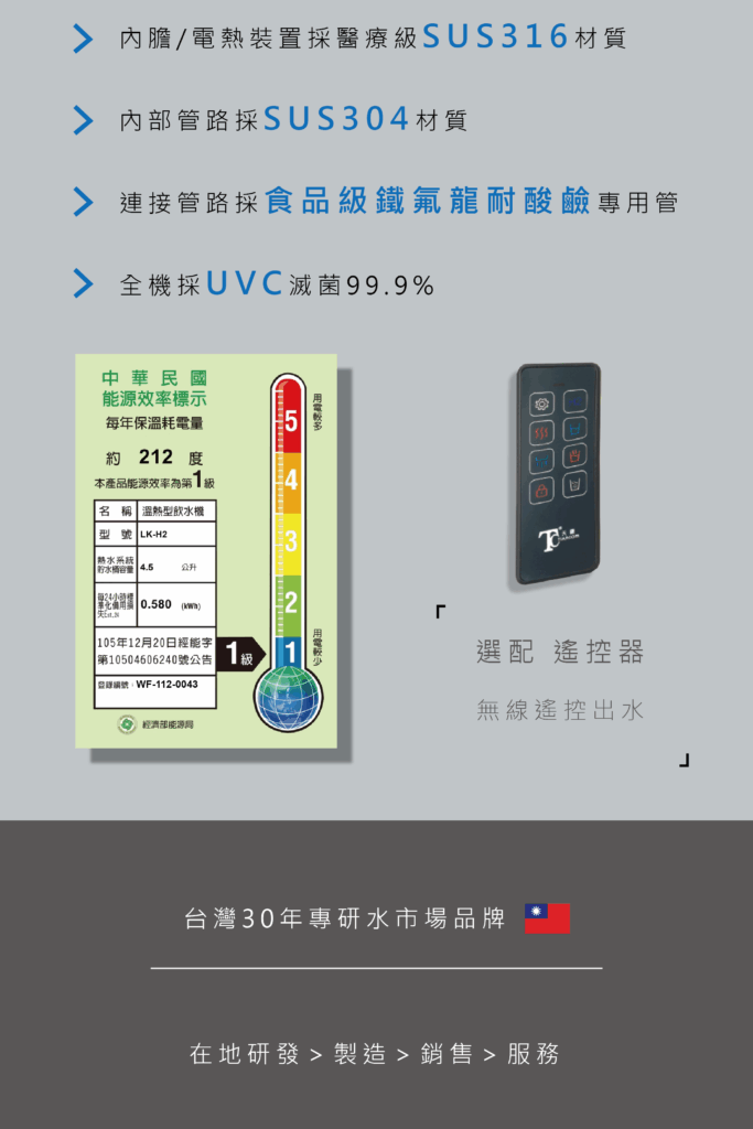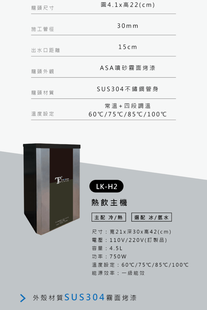 龍頭外觀採SUS304管身加ASA噴砂烤漆 - 主配【LK-H2 廚下溫熱飲機】