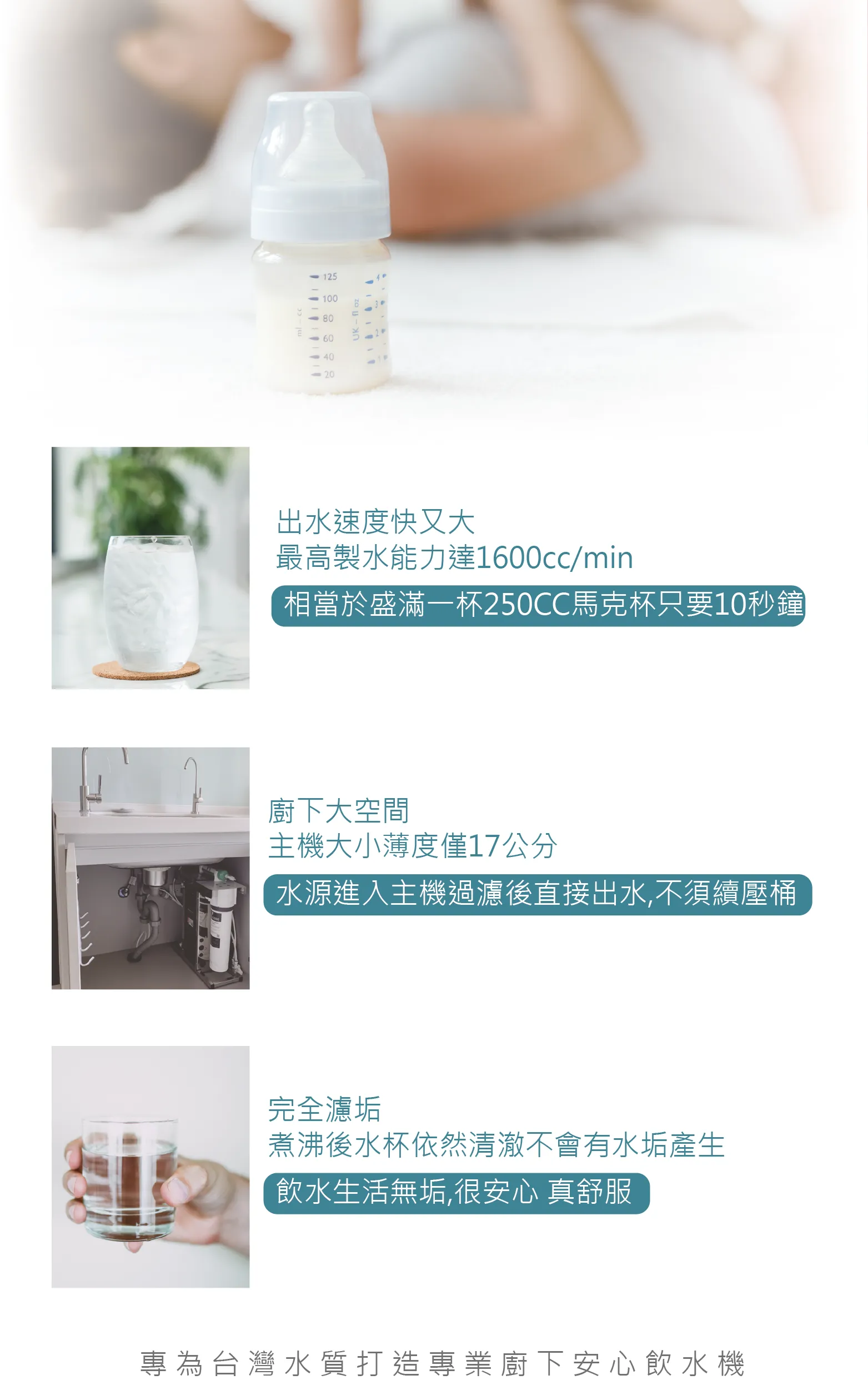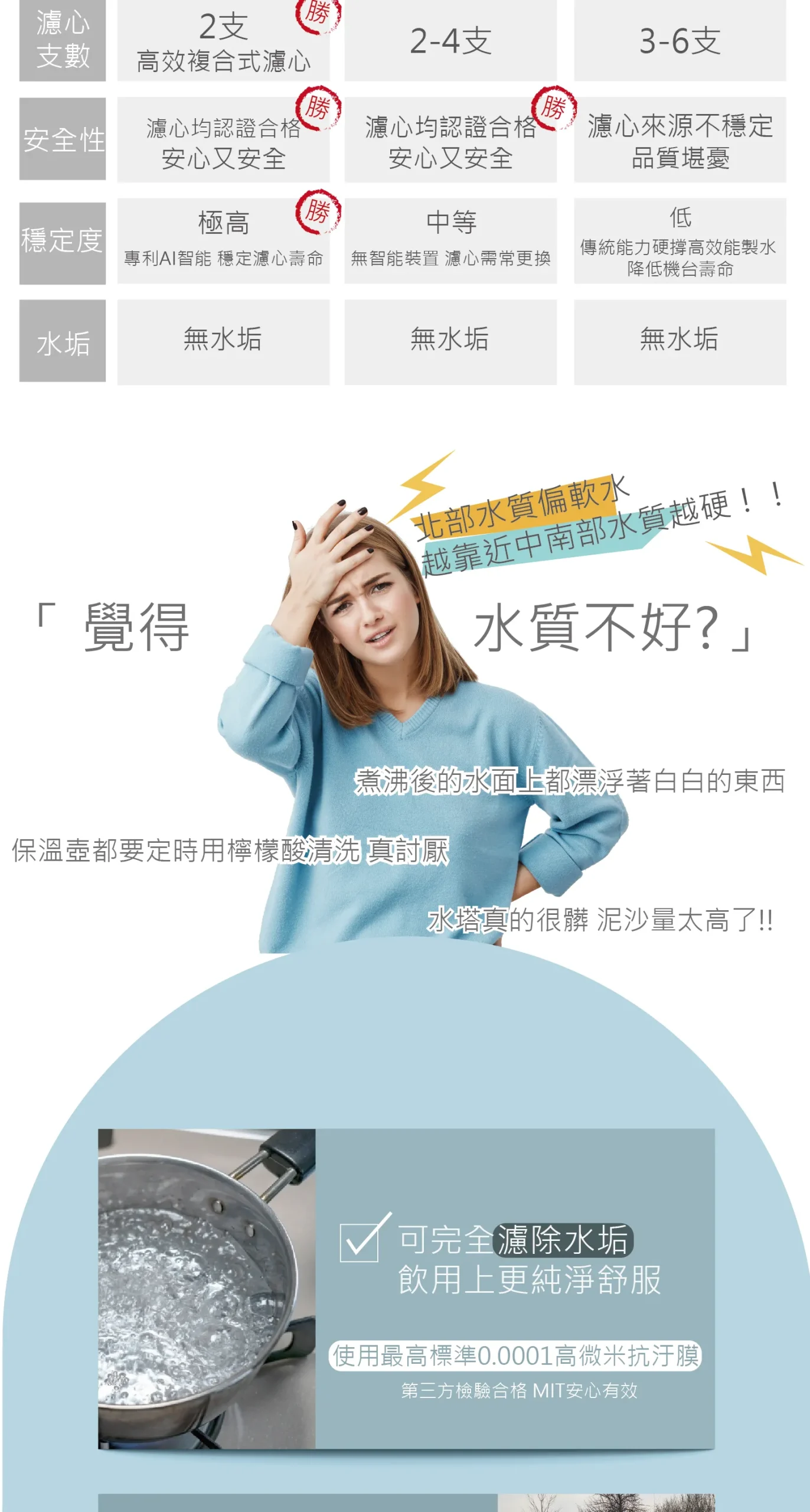 RO 與非 RO 系統皆可達到生飲水等級,主要差異在於是否能完全去除水垢。