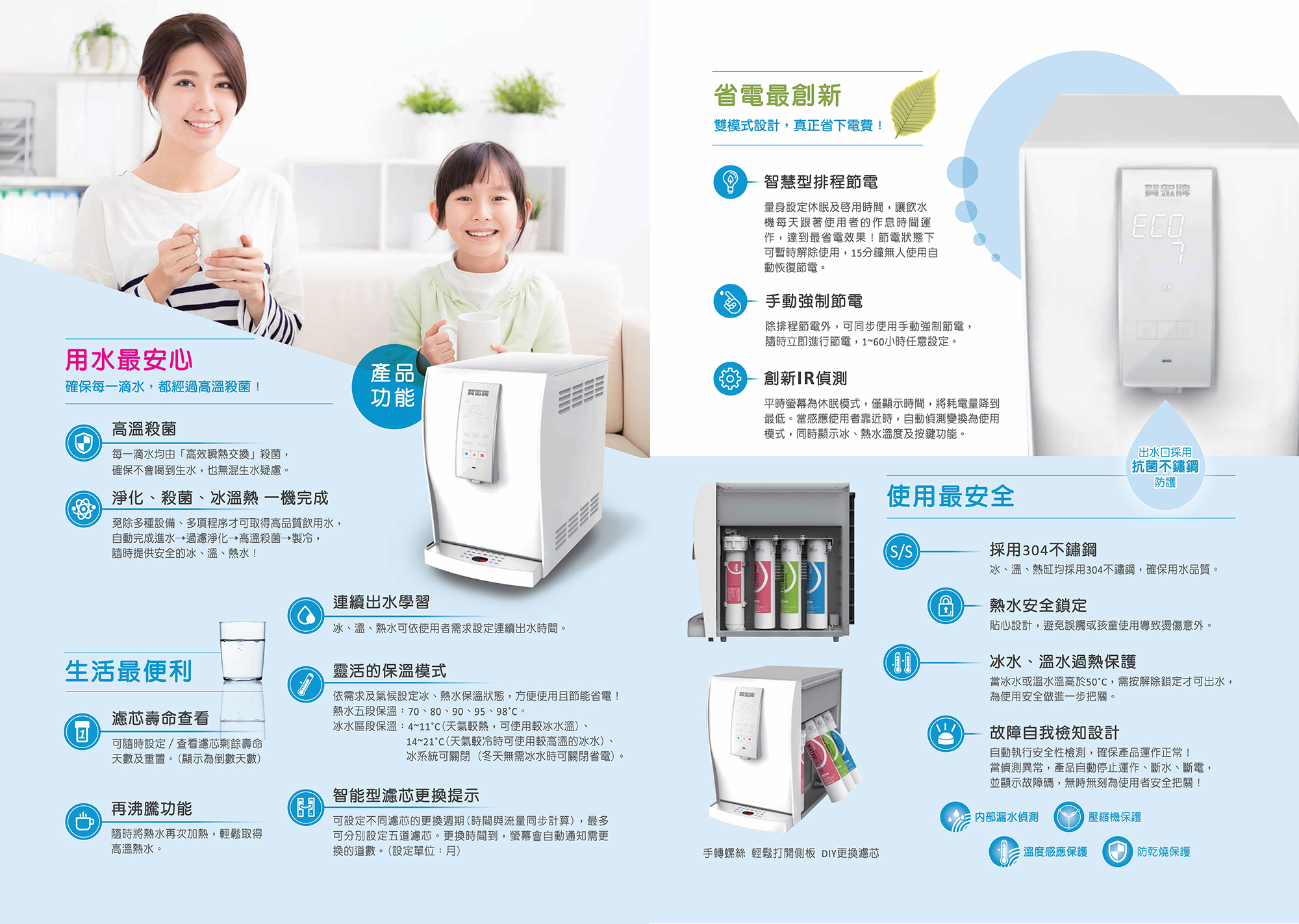 - 高溫殺菌、製冷,讓「淨化、殺菌、冰溫熱」一機完成